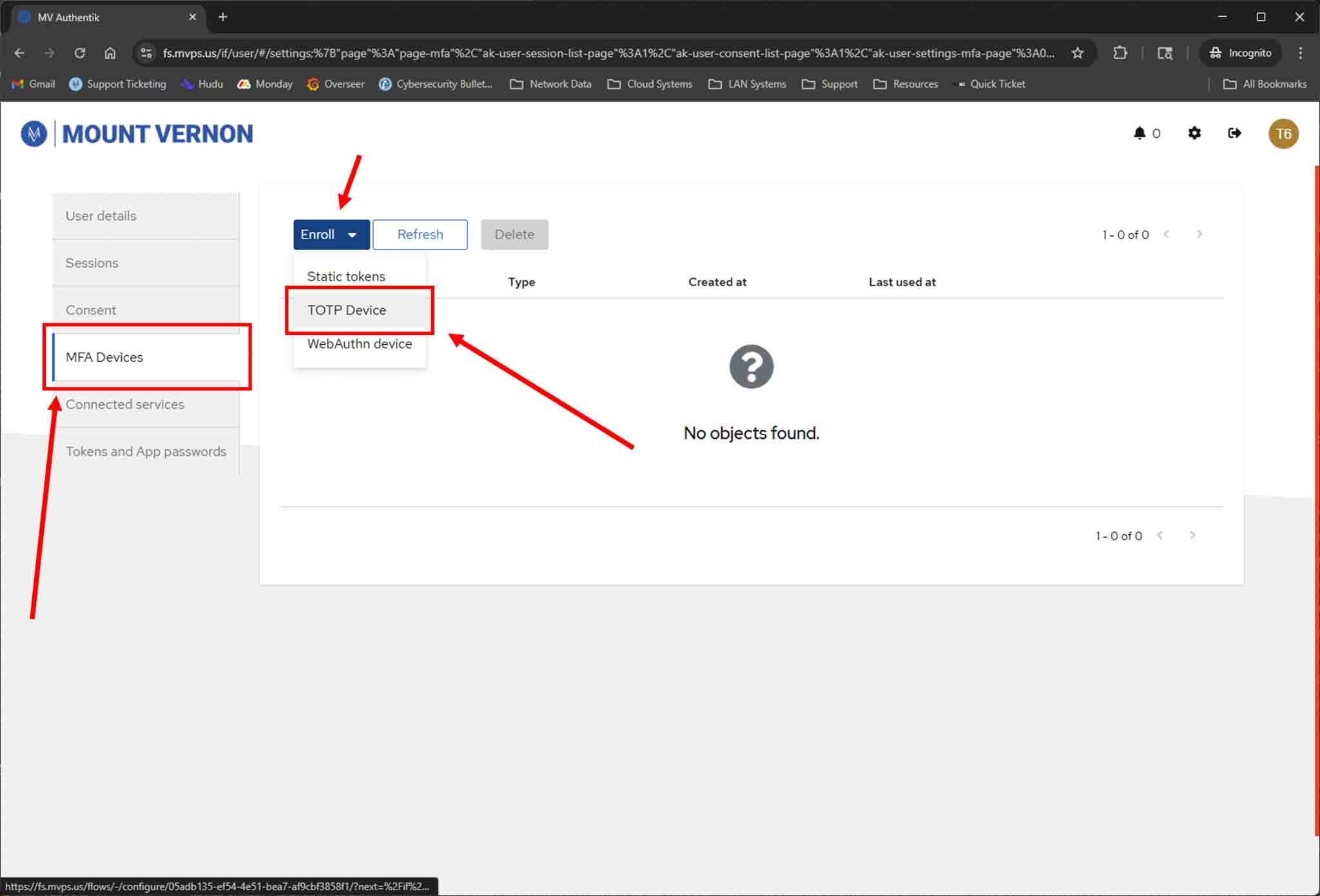 - In the settings menu, navigate to the MFA Devices tab, then click the Enroll button and select TOTP Device