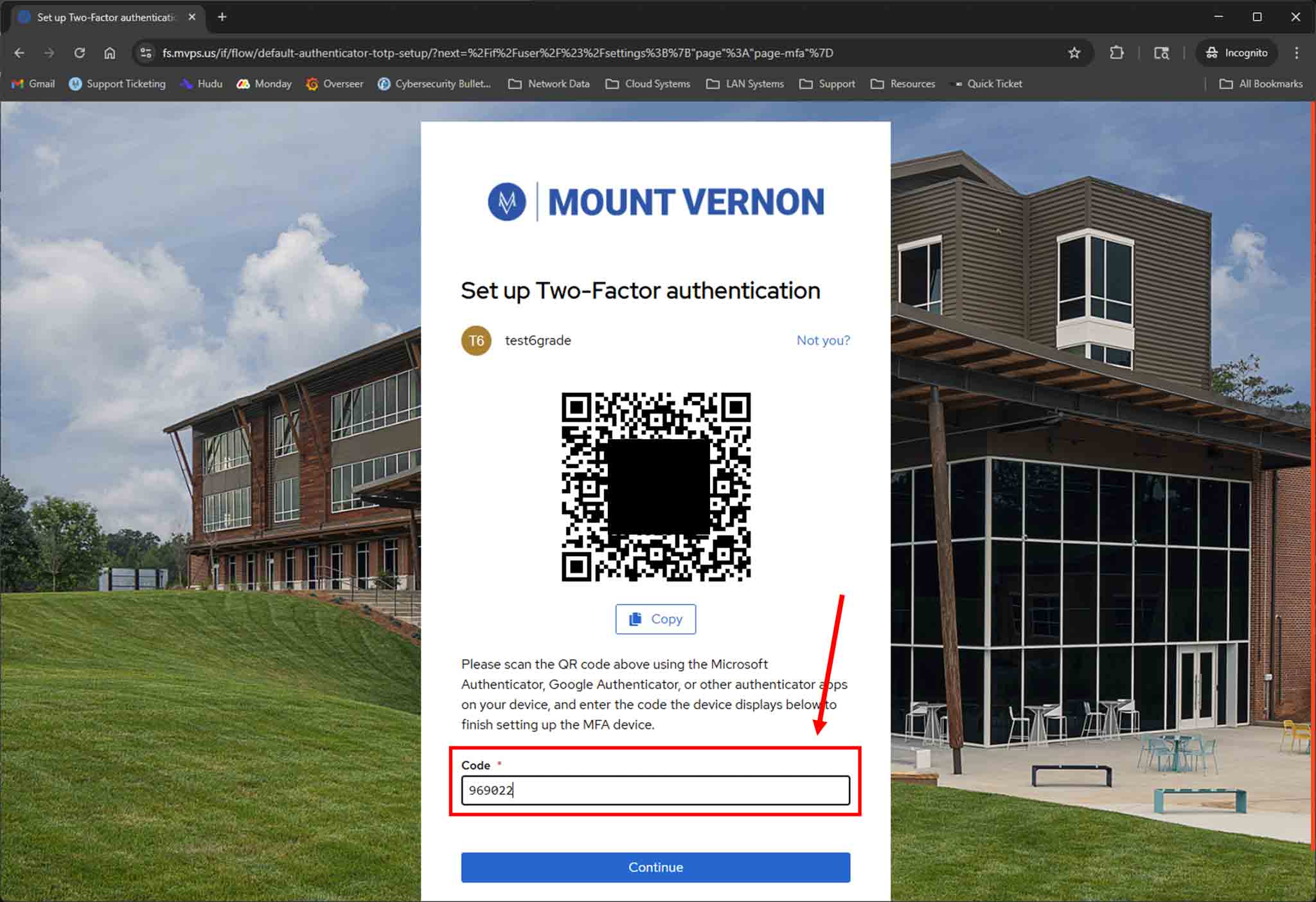 - In the Code field under the QR code, enter the code that is showing in the Bitwarden Authenticator App entry that was created, then click Continue