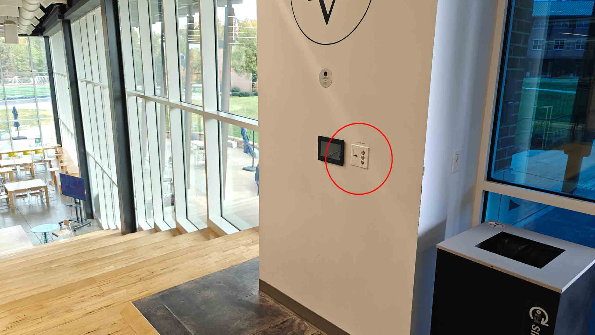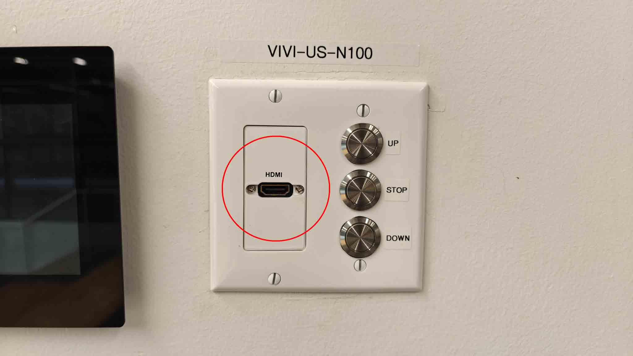 - On the column by the front door, there is a wall panel that has an HDMI port and 3 buttons