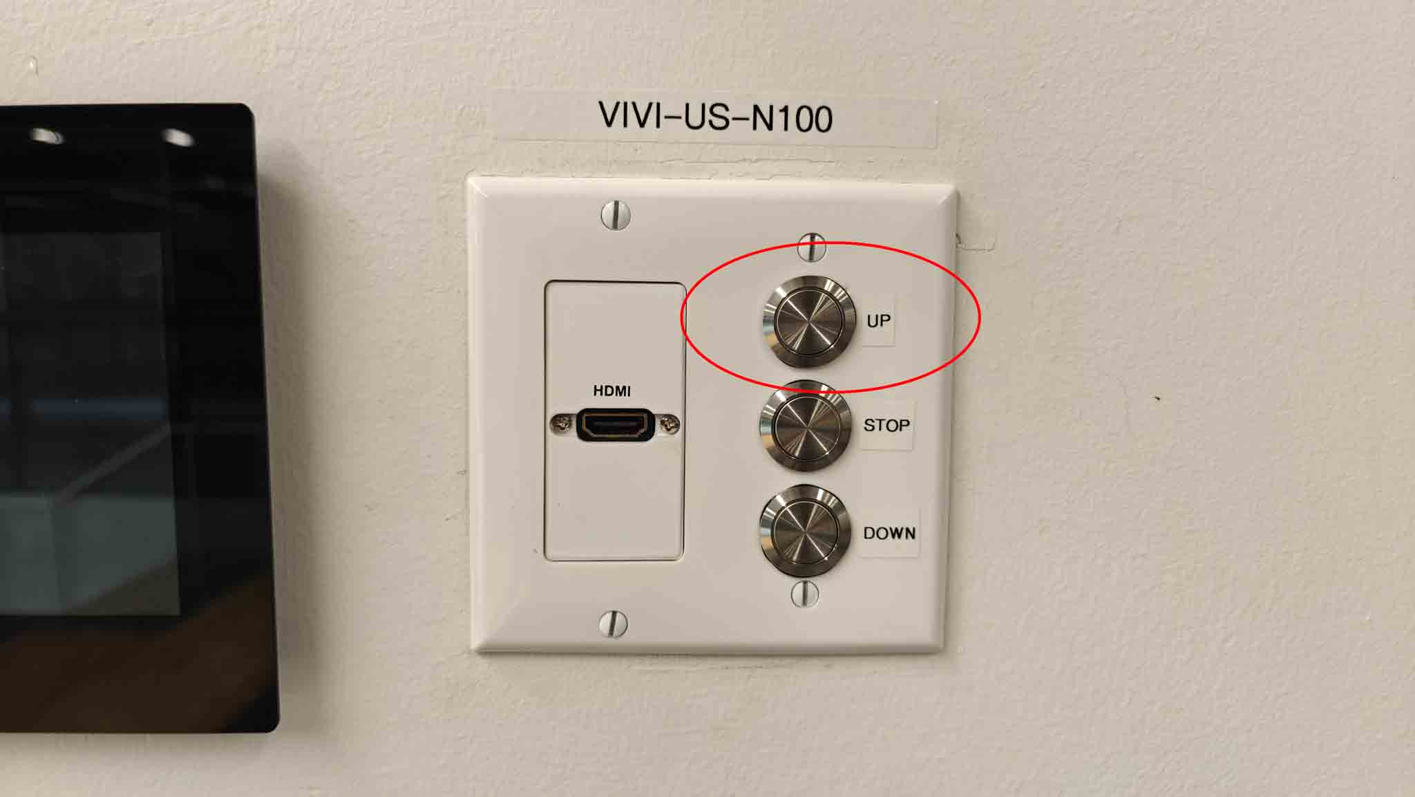 - On the wall panel, momentarily push the UP button to raise/store the projector screen